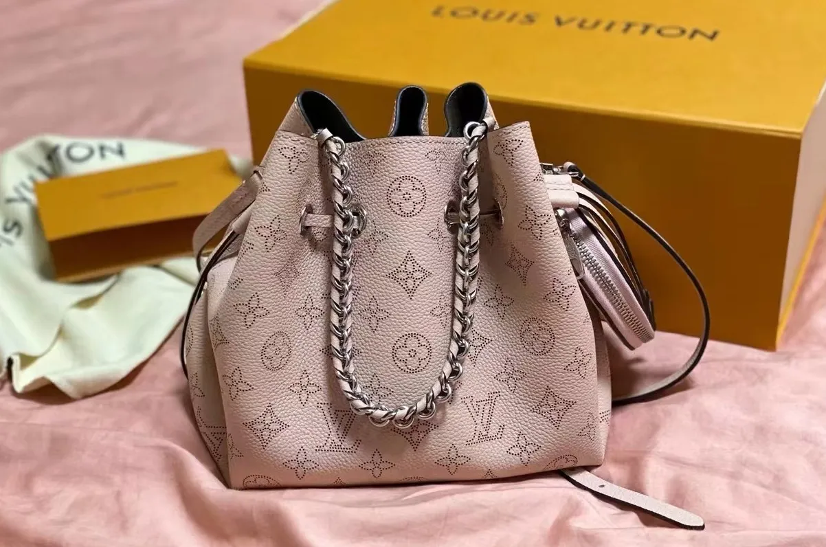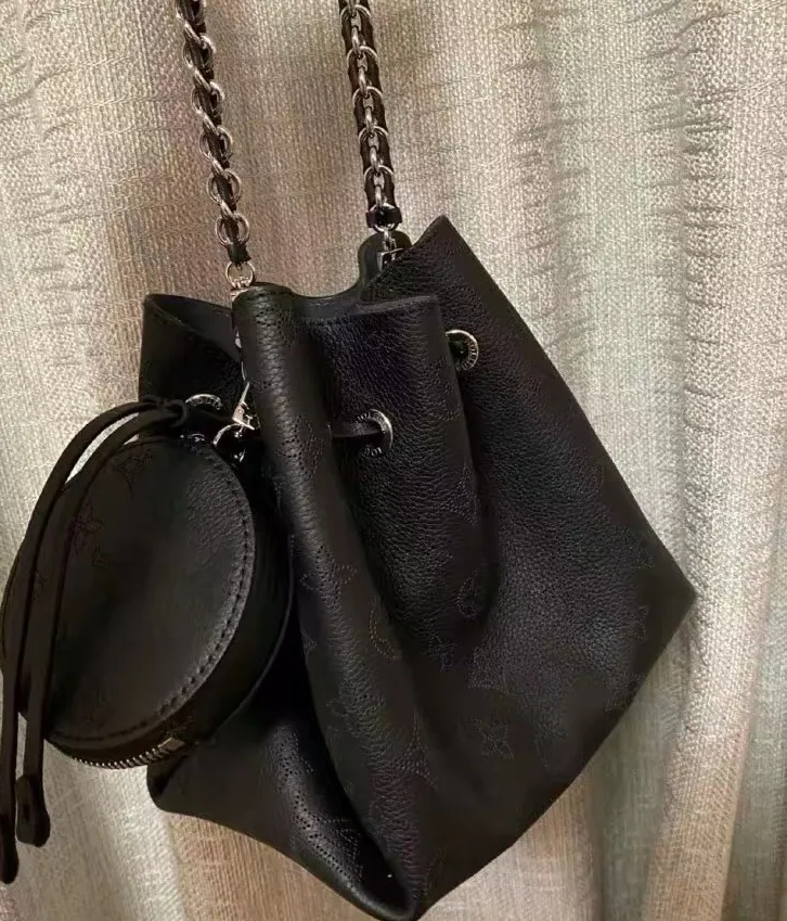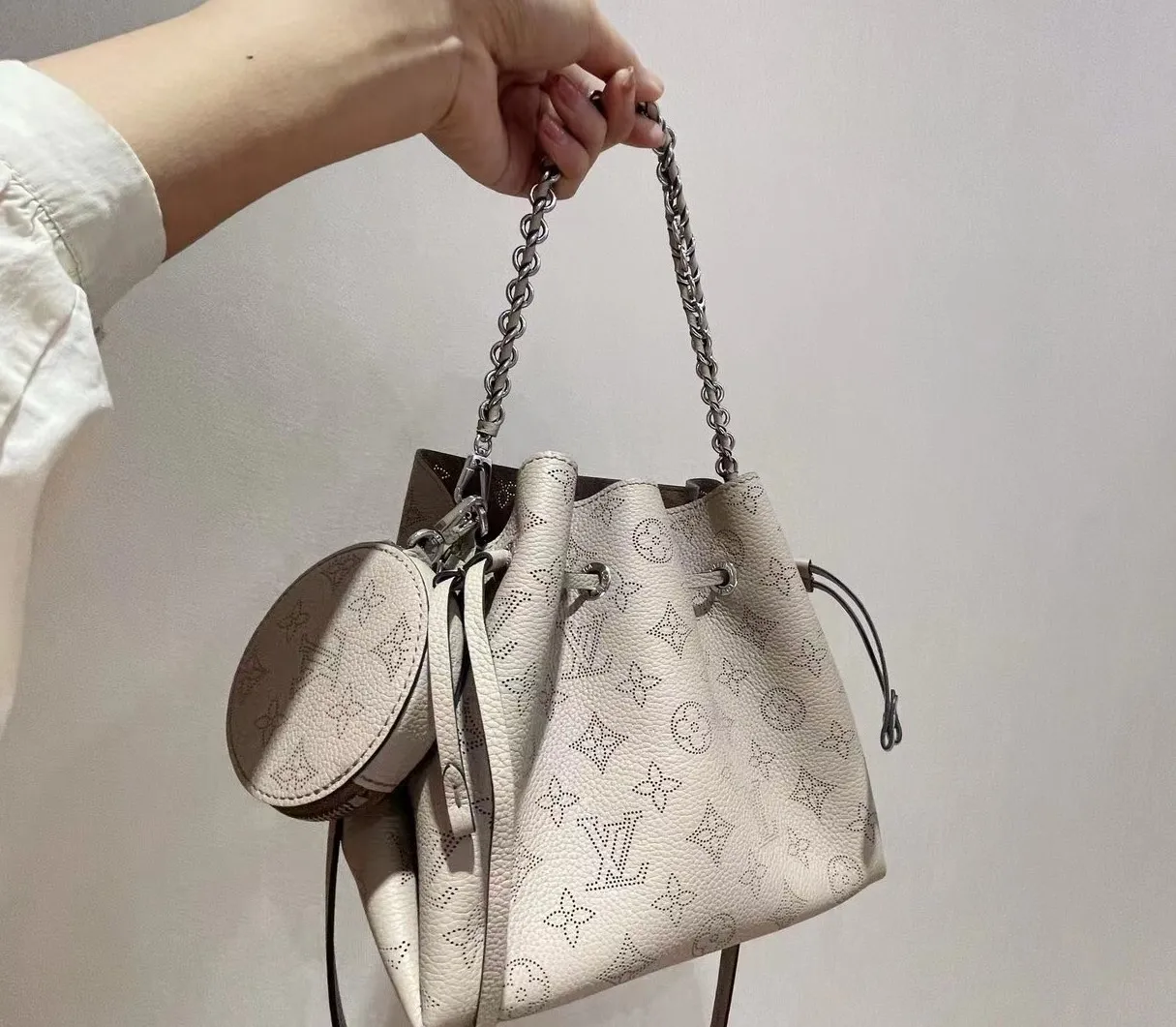 モノグラム パターンをパーフォレーションで描いたマヒナ レザーが印象的な「ベラ」。丸みを帯びたコインパースをあしらったコンパクトなバケットバッグです。コインパースの片面にはパーフォレーションで施したミニチュアバージョンのモノグラム パターンが躍り、モダンでトレンディな雰囲気を演出します。洗練されたレザーを編み込んだメタルハンドルと、取外し可能なレザーストラップでさまざまな持ち方をお楽しみいただけます。