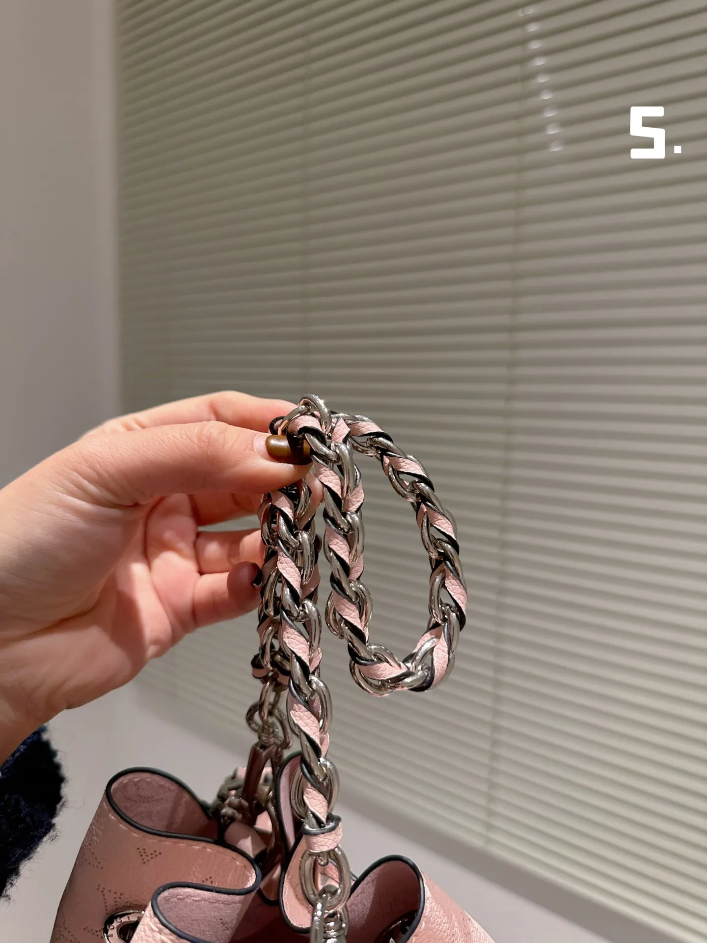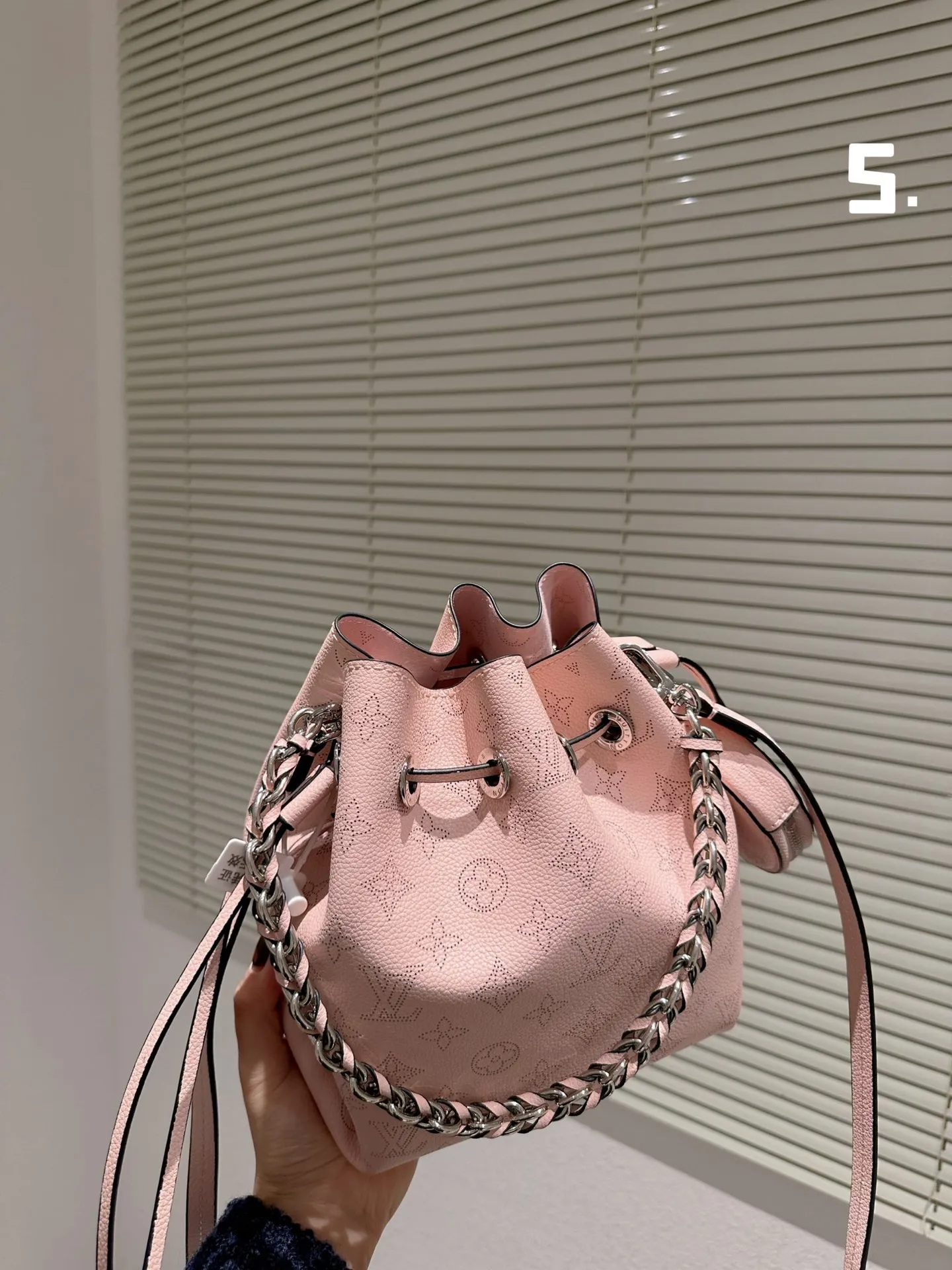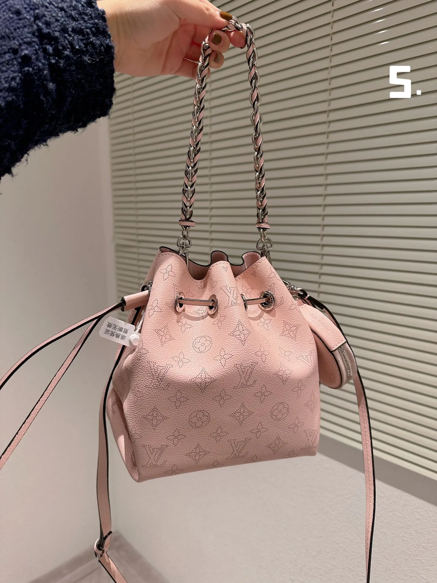 モノグラム パターンをパーフォレーションで描いたマヒナ レザーが印象的な「ベラ」。丸みを帯びたコインパースをあしらったコンパクトなバケットバッグです。コインパースの片面にはパーフォレーションで施したミニチュアバージョンのモノグラム パターンが躍り、モダンでトレンディな雰囲気を演出します。洗練されたレザーを編み込んだメタルハンドルと、取外し可能なレザーストラップでさまざまな持ち方をお楽しみいただけます。