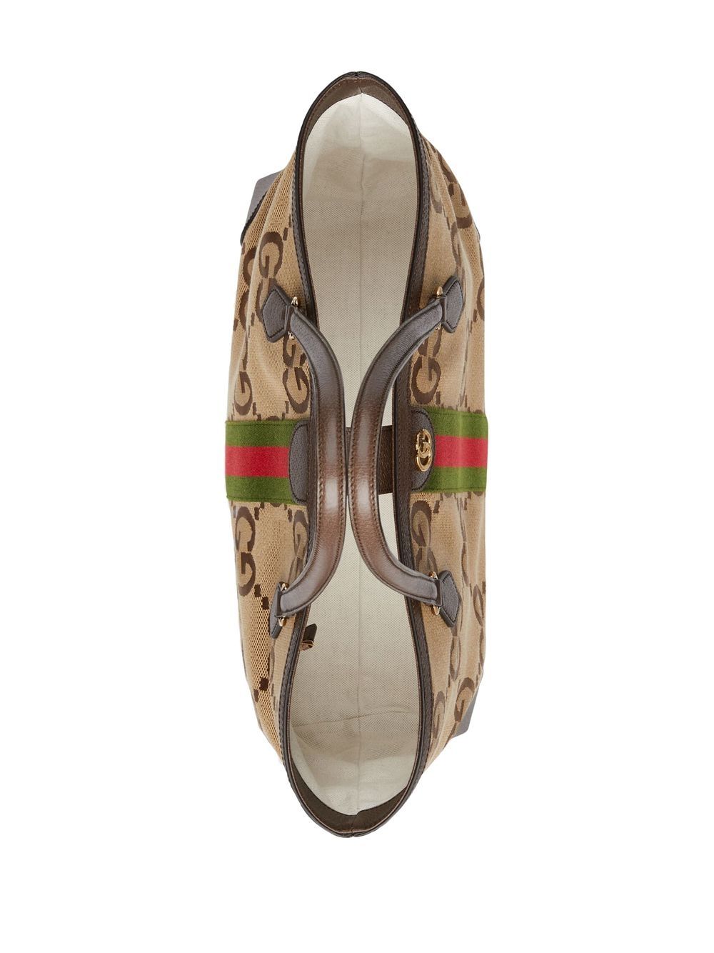 ベージュ、マルチカラー、レザー、キャンバス、ジャンボGGキャンバス、ウェブストライプ、ゴールドトーンのロゴプレート、ラウンドトップハンドル x 2、メインコンパートメント。