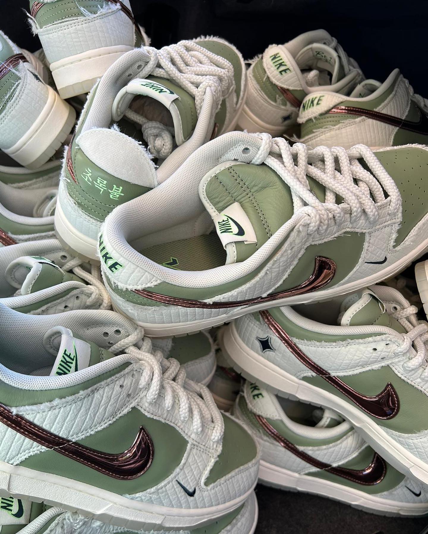 このユニークなNike Dunk Low Be 1 of Oneは、オリーブレザーのベースにライトグリーンのキルティングオーバーレイを組み合わせているのが特徴だと伝えられている。 サイドパネルのメタリックなスウッシュがスニーカーに新たな次元を加えます