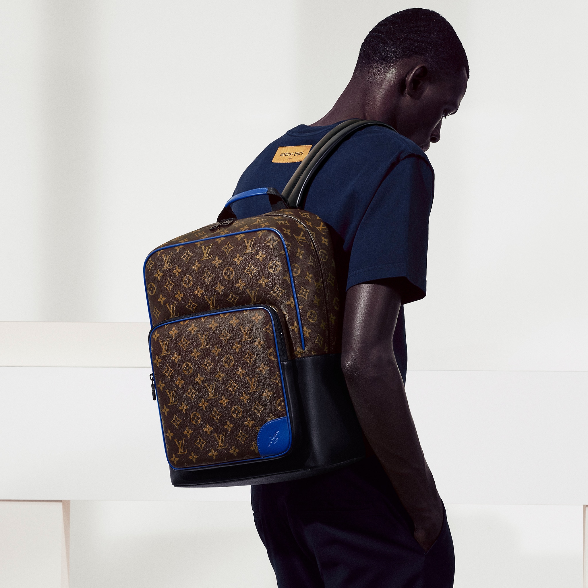 モノグラム・マカサー キャンバスにカウハイドレザーのトリミングを施した「ディーン・バックパック」。下部のコーナー、トップハンドル、フロントの外ポケット周辺に鮮やかなブルーをあしらい、モダンな雰囲気に仕上げました。ファスナー付きのフロントポケットに加え、内側には3つのポケットを備え、ノートパソコンも収納できます。
