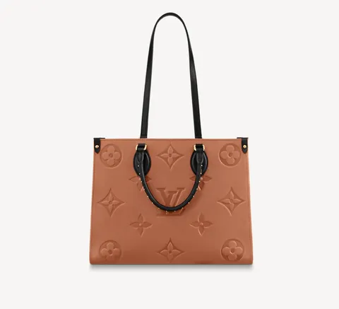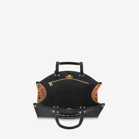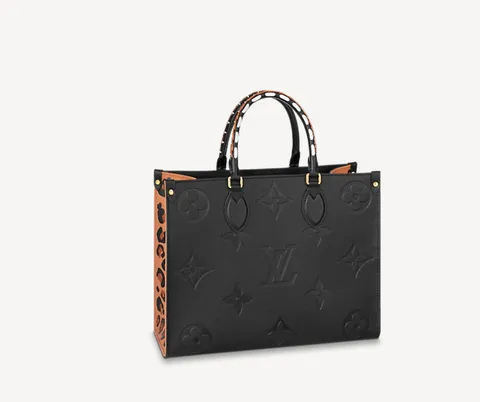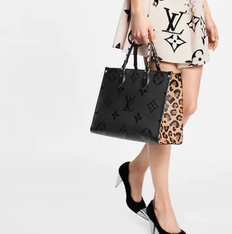 2021年の「ワイルド・アット・ハート」カプセル・コレクションに登場した「オンザゴー MM」。艶やかなモノグラム・パターンのエンボス加工が特徴のモノグラム・アンプラント レザーで仕立て、サイドにはレオパード・プリントをあしらいました。編み上げレザー製のトップハンドルと長めのレザーストラップで、さまざまな持ち方をお楽しみいただけます。その名の通り、女性の必需品をしっかり収納できるアイテムです。
